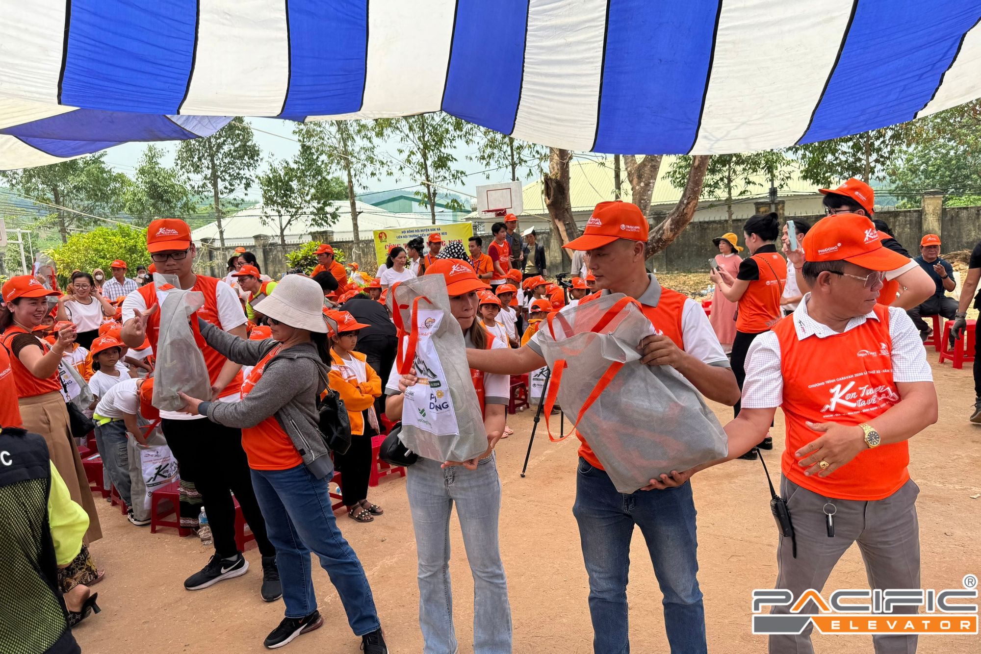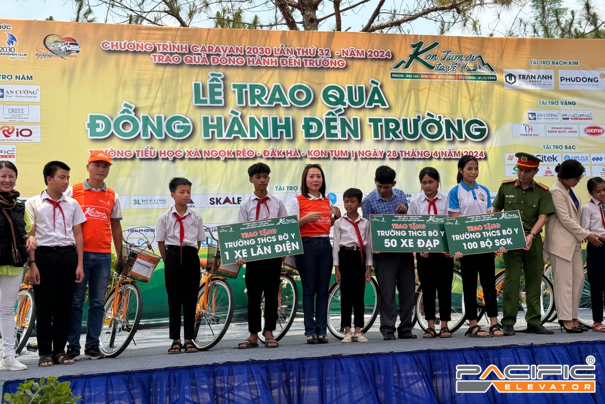 Trong chuyến đi lần này, Thang Máy Pacific đồng hành cùng Caravan 2030 lần thứ 32 với cương vị nhà tài trợ Vàng cùng các nhà đồng tài trợ đã trao tặng nhiều phần quà ý nghĩa như 10 máy tính bàn, 150 xe đạp, 5 suất học bổng, 732 bộ đồ dùng học tập, 7.400 cuốn sách, 800 chiếc nón, 732 áo khoác đồng phục, 200 bộ sách giáo khoa, 10 bộ bàn ghế cho máy tính, 30 bộ bàn góc học tập, 12 ghế học, 102 máy tính Casio 570 VN Plus, 200 đèn học để bàn, cùng với 732 phần bánh kẹo dành cho học sinh trường tiểu học ở xã Ngọk Réo và trường THCS xã Ngọk Réo (huyện Đắk Hà). Ngoài ra, chúng tôi cũng đã trao tặng 50 xe đạp, 1 xe lăn điện, 100 bộ sách giáo khoa và 5 suất học bổng cho học sinh trường THCS xã Bờ Y (huyện Ngọc Hồi). Tổng kinh phí cho các hoạt động này là gần 1,6 tỷ đồng.