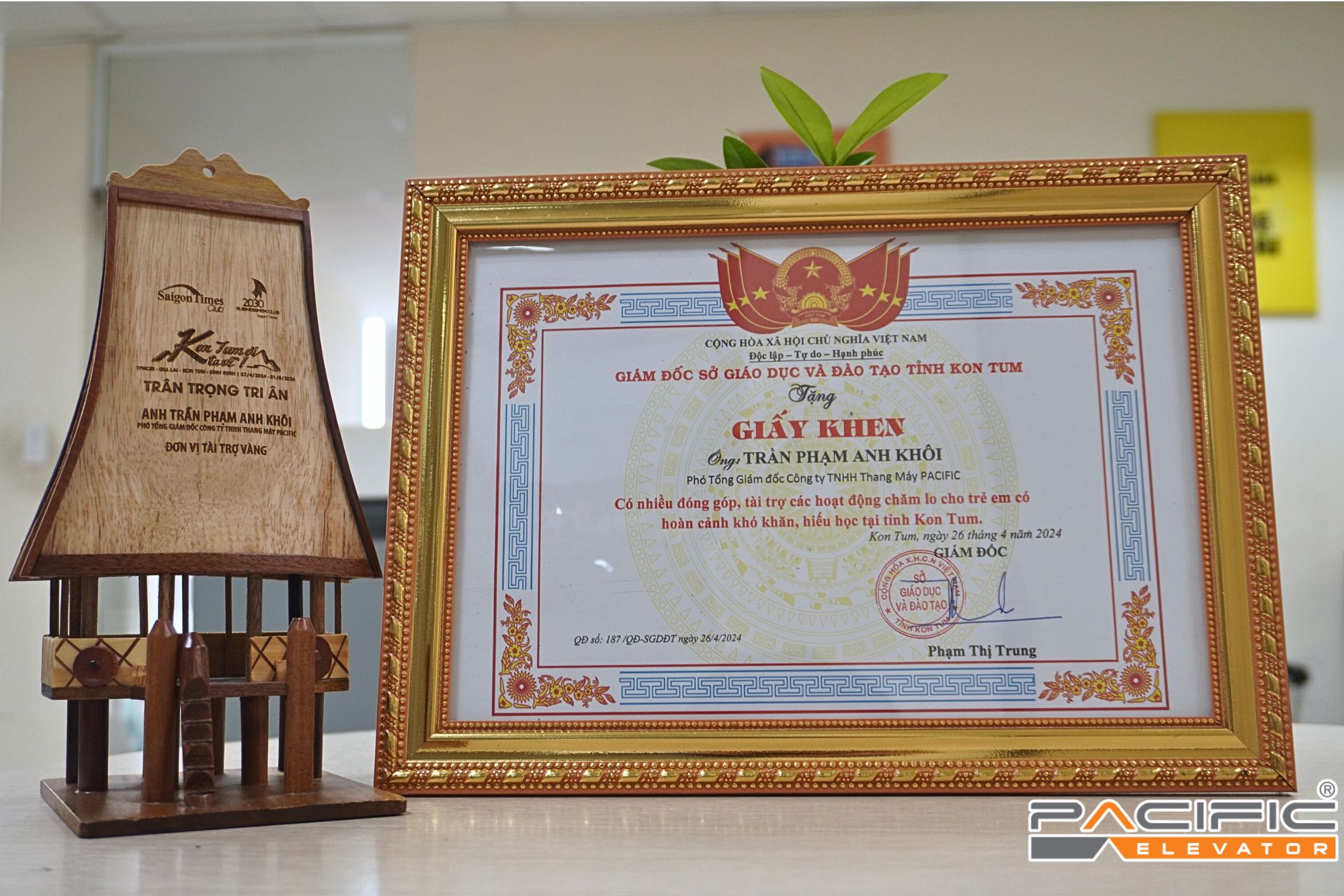 Thang Máy Pacific vinh dự nhận được giấy khen được trao bởi lãnh đạo Sở Giáo dục và Đào tạo có nhiều đóng góp, tài trợ cho các hoạt động chăm lo cho trẻ em có hoàn cảnh khó khăn, hiếu học tại tỉnh Kon Tum.