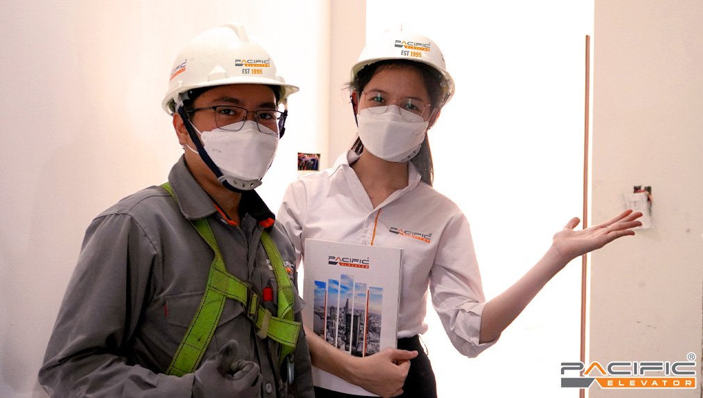 Hình ảnh chuyên viên tư vấn thang máy Pacific tại công trình lắp đặt thang máy gia đình