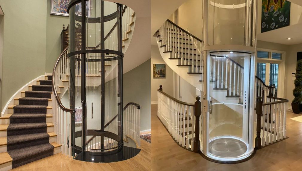 Loại thang máy này có kính cường lực cong đến 360 độ. Hố thang máy và buồng kính cũng được tạo dựng với khung kim loại tròn. Thang máy mini có cabin tròn được thiết kế sang trọng giúp cho ngôi nhà trở nên mềm mại hơn.